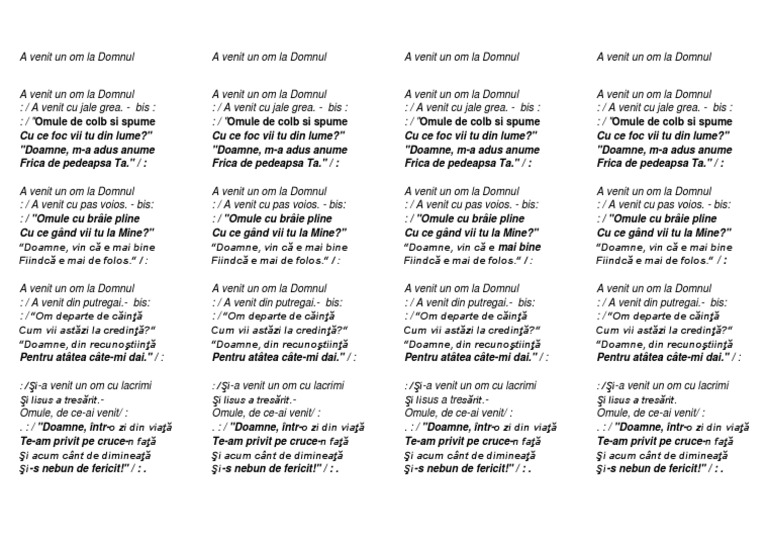 Omule de colb şi spume cu ce foc vii tu din lume. A venit un om la domnul. Doamne m a adus anume frica de pedeapsa ta. A venit cu pas voios.