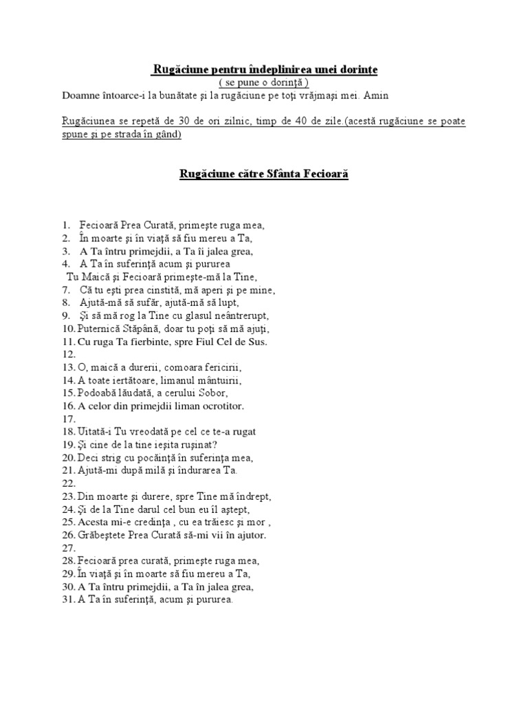 Pentru a rosti cea mai puternică și mai eficientă rugăciune de îndeplinire a dorințelor trebuie să stai în fața unei icoane a fecioarei maria de preferat cu o lumânare sfințită în mână și să rostești următoarea rugăciune. Dacă nu s a făcut aşa nu te mâhni căci nimic nu este veşnic aici si orice lucru este pentru scurtă vreme în această lume. Sfântă maria mă îndrept plin de încredere către tine cerându ți ajutor cred cu tărie că mă vei asculta în necazul meu și mă vei. Folosirea psalmilor pentru indeplinirea tuturor dorintelor dintre toate cartile inspirate de duhul sfint psaltirea este ca soarele intre toate celelalte stele ale cerului.
