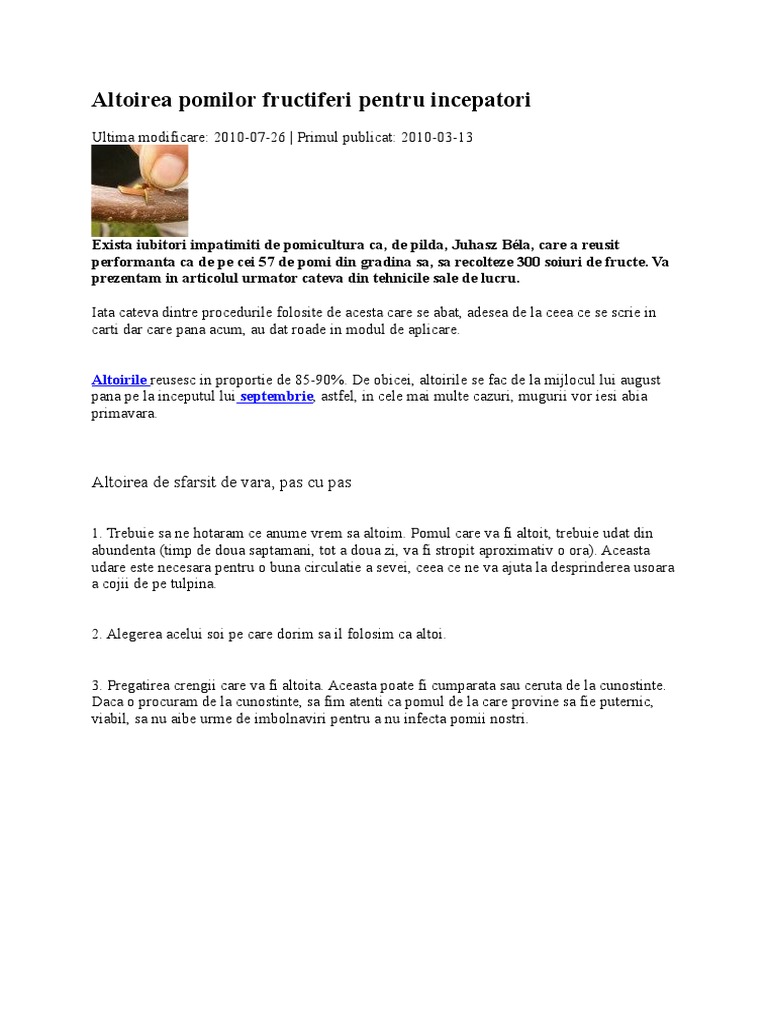 2010 07 26 primul publicat. Altoirea pomilor fructiferi pentru incepatori. Altoirea este tehnica cea mai simpla mai rapida si mai sigura de obtinere a fructelor si florilor dorite pentru ca altoirea se practica si pe arbori ornamentali. Orice persoana care detine o gradina sau o livada stie ca altoirea e un proces necesar pentru obtinerea celor mai bune soiuri.