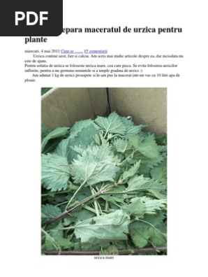 Cand se stropesc rosiile cu urzica. Se umple recipientul cu apa si se acopera. într o găleată punem 500 de grame de cenușă la care adăugăm 5 litri de apă clocotită. Semnul ca maceratul de urzica este gata de folosit este mirosul foarte urat pe care acesta il emana. în urmă cu cinci ani împreună cu tânăra mea soție am decis să nu investim banii câștigați la nuntă în covoare fier de călcat telefoane dar într o căsuță de vacanță.