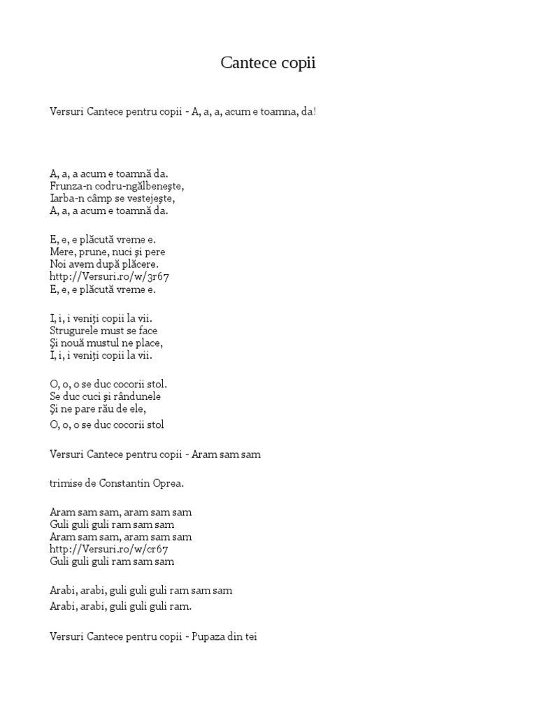 Daca vesel se traieste unchiul meu e gospodar nu mi e frica de bau bau vacuta lola boroboata. Acest site foloseste cookie uri. Versuri cantece pentru copii 1 iunie versuri cantece pentru copii 10 negri mititei versuri cantece pentru copii 4 anisori sprancene versuri cantece pentru copii a a plecat mama la piata versuri cantece pentru copii a venit iarna versuri cantece pentru copii a zis mama versuri cantece pentru copii a zis mama 2 versuri cantece pentru copii a a a acum e toamna da. Cele mai frumoase poezii pentru copii selectate din literatura română și universală special pentru micuțul tău citește alături de copilașul tău aceste poezii fermecate care să vă ajute să petreceți momente speciale împreună iar micuțului să i deschidă apetitul pentru ceea ce înseamnă cultivare literară.
