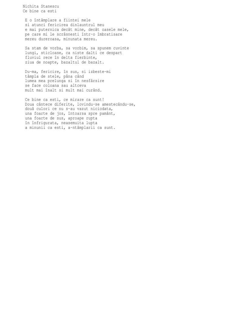 Ce bine ca esti nichita stanescu. S a nascut la 31 martie 1933 in ploiesti. De nichita stanescu e o întâmplare a fiinţei mele şi atunci fericirea dinlăuntrul meu e mai puternică decât mine decât oasele mele pe care mi le scrâşneşti într o îmbrăţişare mereu dureroasă minunată mereu. Să stam de vorba să vorbim să spunem cuvinte lungi sticloase ca niste dalti ce despart. Ce bine ca esti ce mirare ca sunt.