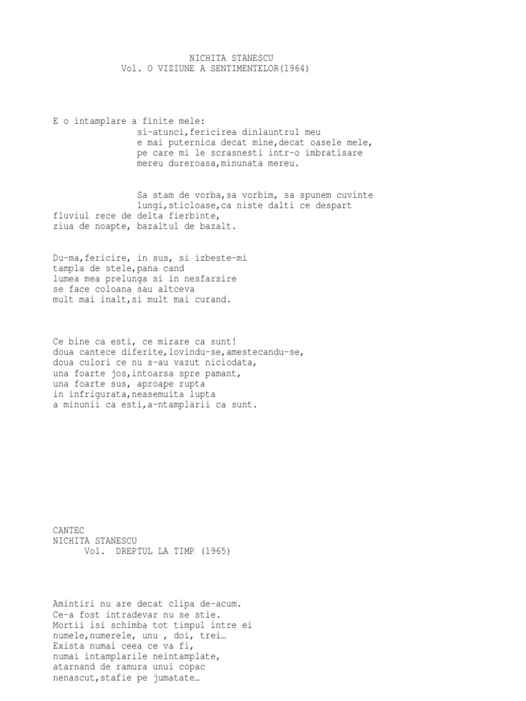 şi atunci fericirea dinlăuntrul meu e mai puternică decât mine decât oasele mele pe care mi le scrâşneşti într o îmbrăţişare mereu dureroasă minunată mereu. 31 martie 1933 ploiești județul prahova deces. Doua cantece diferite lovindu se amestecindu se doua culori ce nu s au vazut niciodata una foarte de jos intoarsa spre pamant una foarte de sus aproape rupta in infrigurata neasemuita lupta a minunii ca esti a ntimplarii ca sunt. Ce bine ca esti nichita stanescu cântec.