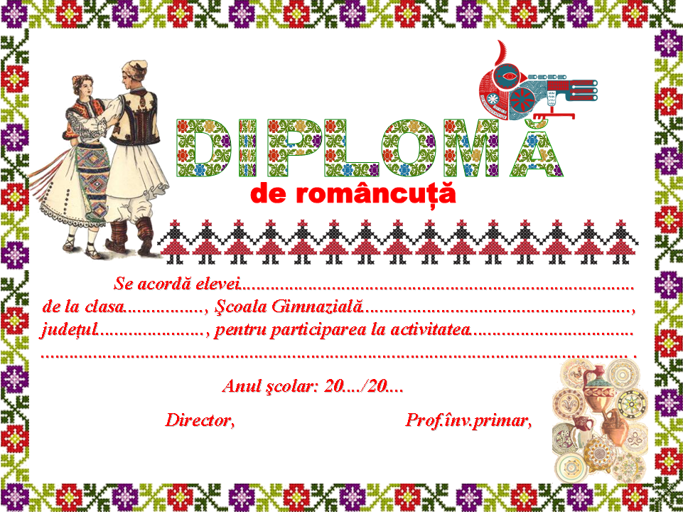 Două diplome de românaşi pentru băieţei şi două diplome de româncuţe pentru fetiţe. Nu am pus la punct toate detaliile dar astăzi m am simţit inspirată şi am realizat patru diplome. Evenimentul românaş şi româncuţă organizat în cadrul parteneriatului daruri de preţ de la străbuni derulat între grădiniţa cu program prelungit nr. De ceva vreme plănuiesc o activitate cu specicific tradiţional românesc deşi nu suntem la prima acţiune de acest fel.