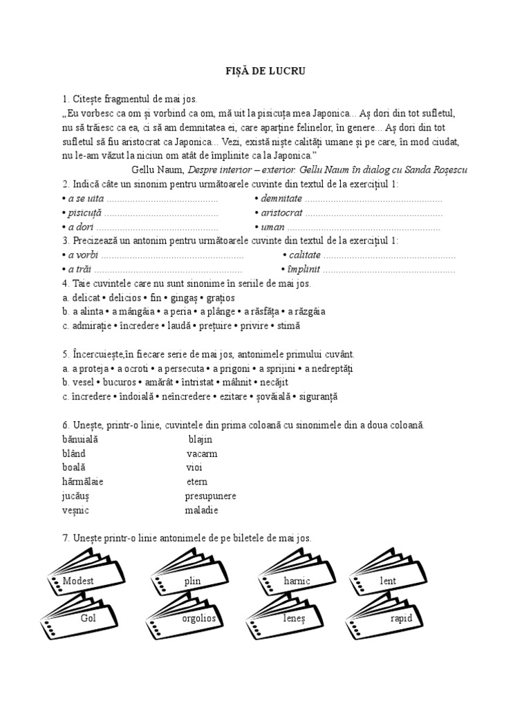 Clasa a i viii a. Documente similare cu fisa de lucru sinonimele si antonimele. Sinonime si antonime pe intelesul elevilor cu ces nivel usor sau mediu învăţământ gimnazial limba şi literatura română fişe de lucru clasa a 5 a. Clasa a i viii a.