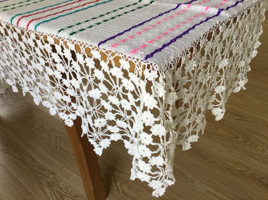 O adevarata bijuterie pentru orice camin. Vanzator premium 98 65 1 946 superba fata de masa in si bumbac margine din macrame lucrat manual. Fata de masa mare crosetata din macrame dantela fina. Pretul pentru o astfel fata de masa porneste de pe 25 lei pentru un mileu mic si poate ajunge si pana la 2000 de lei pentru dimensiuni mai mari.