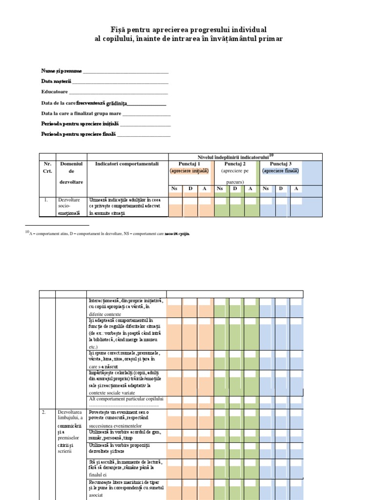 Descrie importanţa apei aerului pentru viaţă şi a modalităţilor de protecţie împotriva poluării 24 extras din fişa pentru aprecierea progresului individual al copilului înainte de înscrierea în clasa pregătitoare conform notei men nr. Fişa pentru aprecierea progresului individual al copilului înainte de înscrierea în clasa pregătitoare anexa 3. Aprecierea finală bilanțul în fiecare moment considerat oportun de educatoare pentru fiecare copil în parte reflectă nivelul acestuia la un anumit moment și sprijină urmărirea progresului copilului raportat la aplicarea curriculumului precum și urmărirea progresului copilului în diferitele momente ale dezvoltării acestuia pentru a putea adapta metodele de intervenție a. Selection file type icon file name description.