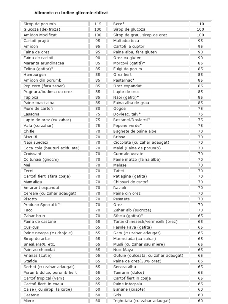 Mai puțini carbohidrați mai puțini fulgi de ovăz de exemplu sau fibrele de graham pâinea de graham deci tot ce conține multe fibre poate constitui un aliment cu indice glicemic scăzut deci până în 55. Metoda de gatire cu cat un aliment este gatit mai mult cu atat mai mult creste indicele glicemic spre exemplu pastele fierte al dente au indice glicemic mai mic decat cele fierte foarte bine. Lista fructelor si legumelor cu indice glicemic scazut stiu ca toate va speriati cand auziti de grasimi insa eu as fi mai speriata cand aud de carbohidrati fie ei simpli sau complecsi. Alimentele cu indicele glicemic ridicat sunt cele care au valoarea de 60 sau mai mult.